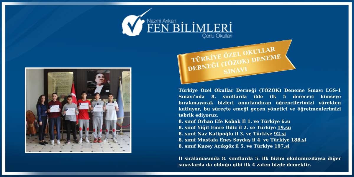 Türkiye Özel Okullar Derneği (TÖZOK) Deneme Sınavı LGS-1 Sınavı'nda 8. sınıflarda ilde ilk 5 dereceyi kimseye bırakmayarak bizleri onurlandıran öğrencilerimizi yürekten kutluyor, bu süreçte emeği geçen yönetici ve öğretmenlerimizi tebrik ediyoruz.