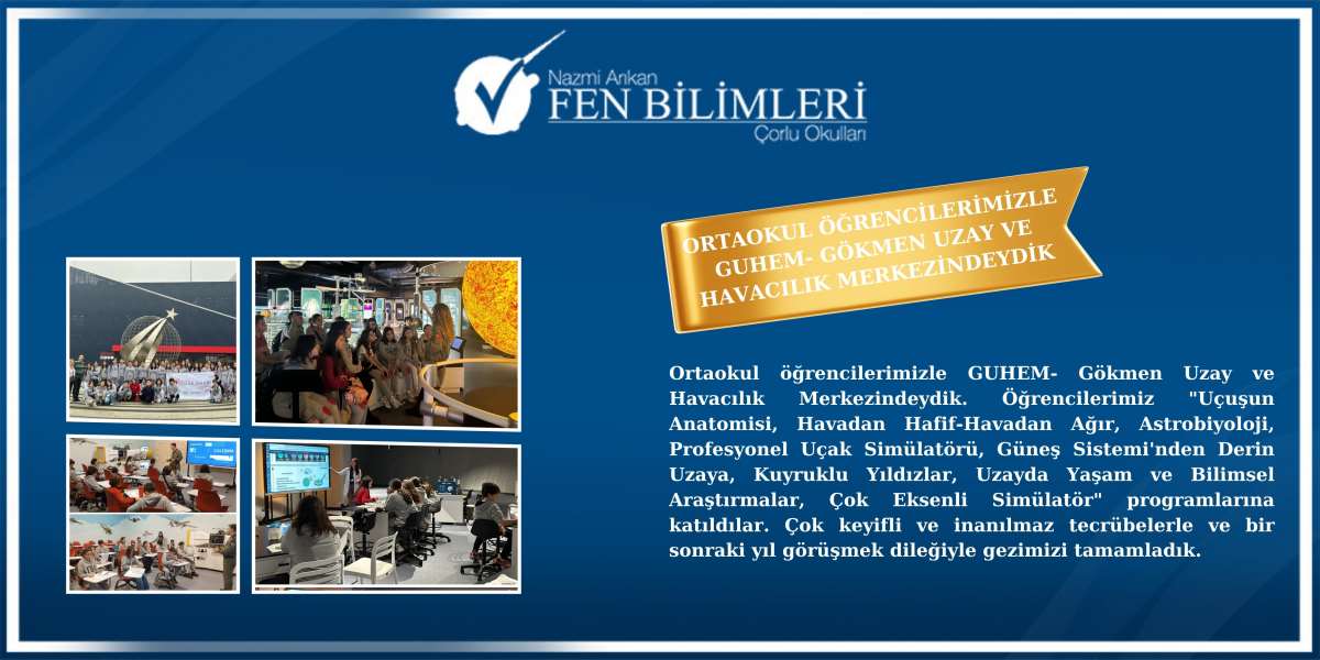 Ortaokul öğrencilerimizle GUHEM- Gökmen Uzay ve Havacılık Merkezindeydik. Öğrencilerimiz "Uçuşun Anatomisi, Havadan Hafif-Havadan Ağır, Astrobiyoloji, Profesyonel Uçak Simülatörü, Güneş Sistemi'nden Derin Uzaya, Kuyruklu Yıldızlar, Uzayda Yaşam ve Bilimsel Araştırmalar, Çok Eksenli Simülatör" programlarına katıldılar. Çok keyifli ve inanılmaz tecrübelerle ve bir sonraki yıl görüşmek dileğiyle gezimizi tamamladık.
